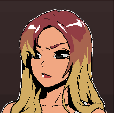 A bobbed haircut the color of ripe persimmons shines beneath a ribboned headband.